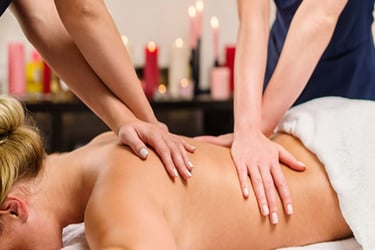 Two therapists work simultaneously in a synchronized massage for a deeply immersive and relaxing experience.